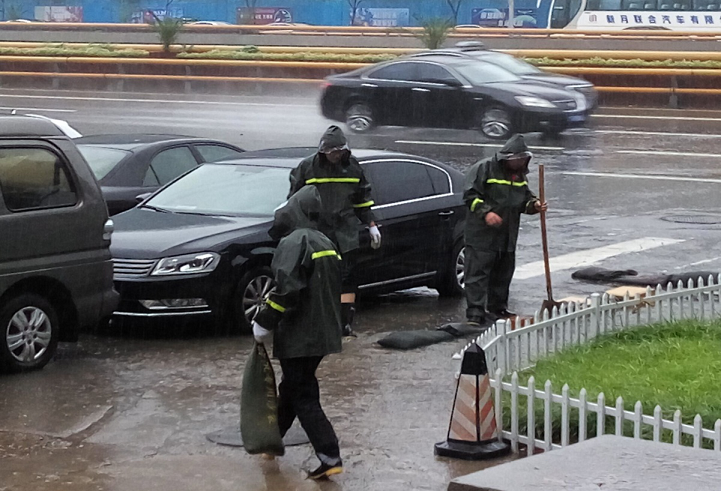7月20日,北京地区特大暴雨如期而至,来势汹汹,给人才中心的防汛安全工作带来严峻挑战。人才中心档案库在办公楼地下一层,为维护六万份档案的安全,防汛应急领导小组成员频繁巡视档案管理部办公区及周边的各个重点部位,确保万无一失。档案管理部杨向峰主任和王然舍小家顾大家,通宵值班,以防险情来袭。期间发现地下档案室多处地漏出现了不同程度的渗水,工作人员迅速联系物业进行抢修,有效的封堵了渗水,防止了险情的加剧。暴雨倾盆导致人才中心办公楼前的地面积水成潭,严重影响中心员工及前来办理业务的人员正常出入。综合管理部周千、穆铭立即放下手中繁忙的工作,和保安储师傅一起穿上雨衣、雨靴,手持铁锹将地面的积水铲到旁边的草丛中,并将一包包沙袋从地下室扛到积水处,横竖分别码放一排,在原本无法行走的水路上为来往的行人们搭建了一条通行道。