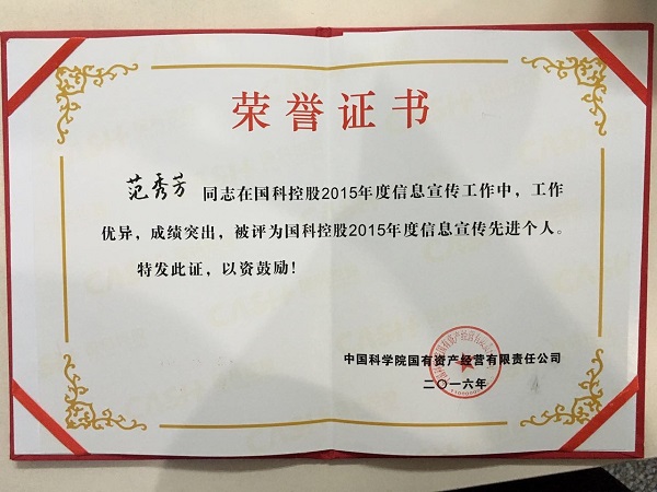 近日,国科控股下发通知,通报表彰2015年度信息宣传先进单位和先进个人。中科创嘉公司范秀芳同志荣获2015年度信息宣传先进个人称号。