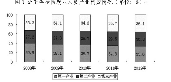 年末全国就业人员76704万人,比上年末增加284万人;其中城镇就业人员37102万人,比上年末增加1188万人。全国就业人员中,第一产业就业人员占33.6%;第二产业就业人员占30.3%;第三产业就业人员占36.1%。2012年全国农民工总量达到26261万人,比上年增加983万人,其中外出农民工16336万人。