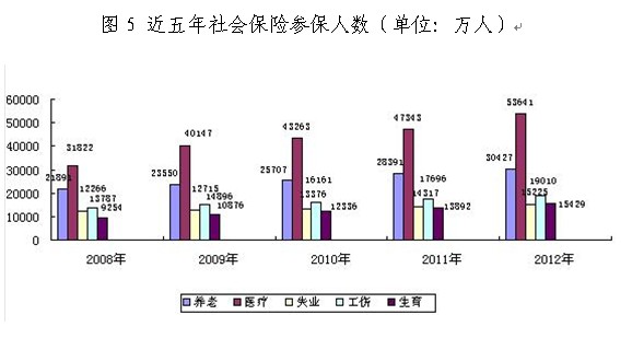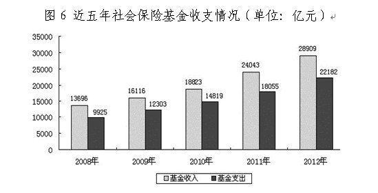 社会保险工作深入开展,社会保障体系建设取得重大进展。全年五项社会保险(不含城乡居民社会养老保险)基金收入合计28909亿元,比上年增长4866亿元,增长率为20.2%。基金支出合计22182