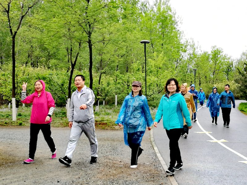 2018年4月22日早上8点半,活动如期进行,虽然天空飘着小雨,丝毫没有影响大家的参与热情。在专业教练的指导下,所有参与者都进行了热身,然后党支部书记聂华进行了简短的发言,并宣布徒步大会正式开始。