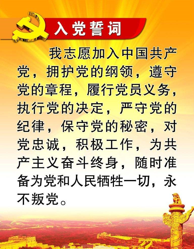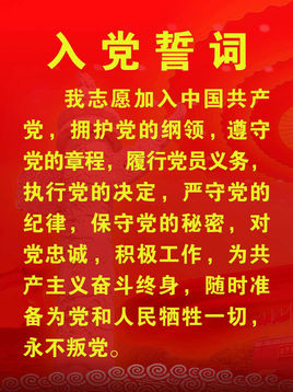 我志愿加入中国共产党,拥护党的纲领,遵守党的章程,履行党员义务,执行党的决定,严守党的纪律,保守党的秘密,对党忠诚,积极工作,为共产主义奋斗终身,随时准备为党和人民牺牲一切,永不叛党。