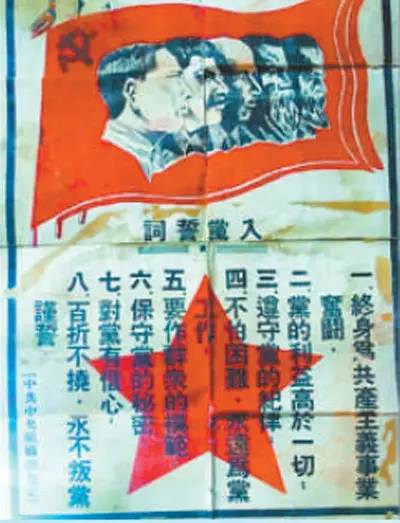 在中国革命博物馆珍藏着一幅饱经血与火洗礼的《入党志愿书》,这是井冈山时期保存的唯一党证。它的中间竖行排列着五句话:牺牲个人,严守秘密,阶级斗争,努力革命,服从党纪,永不叛党。