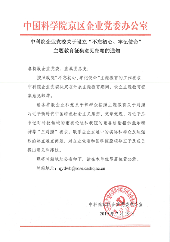 按照我院“不忘初心、牢记使命”主题教育的工作安排,院党组决定在开展主题教育期间,设立主题教育征集意见邮箱,听取基层单位和干部群众对院党组和党组成员在贯彻落实党中央决策部署和习近平总书记重要指示批示精神,推动全面从严治党向纵深发展,遵守中央八项规定精神和院党组实施办法、持之以恒反对“四风”,践行国家战略科技力量初心和使命、攻坚克难,坚持群众路线、解决群众反映强烈的热点难点问题,知敬畏、存戒惧、守底线等方面的意见和建议。