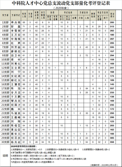 2020年度,流动党支部书记考评工作按照本人述职、总支考核、党委审定的流程已经完成,结合年度流动党支部量化积分相关数据及排名,现将考评结果通报如下: