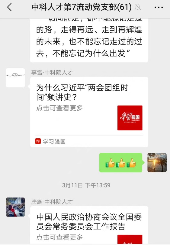 3月4日,乘2021年“两会”开幕东风,中科院人才党总支第7流动党支部举行以“担当百年使命 学习两会精神”为主题的线上支部活动。 两会期间,党员们通过“学习强国”APP和其他信息渠道,关注两会热点,了解两会进展,先后组织了两会开幕式、代表(委员)通道、习主席讲话、两会新举措、两会提案、中小企业发展、法律、教育、环保等方面进行了线上学习,并将学习内容和体会在支部群里分享,带动支部其他党员学习。