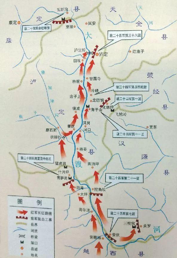 红四团官兵在天降大雨的情况下,在崎岖陡峭的山路昼夜奔袭120公里,在王开湘、杨成武的指挥下,22名突击队员沿着枪林弹雨和火墙密布的铁索踩着铁链夺下桥头,并与左岸部队合围占领了泸定桥。