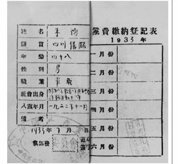 1933年7月,中革军委直属队发给朱德的“党费缴纳登记表”。
