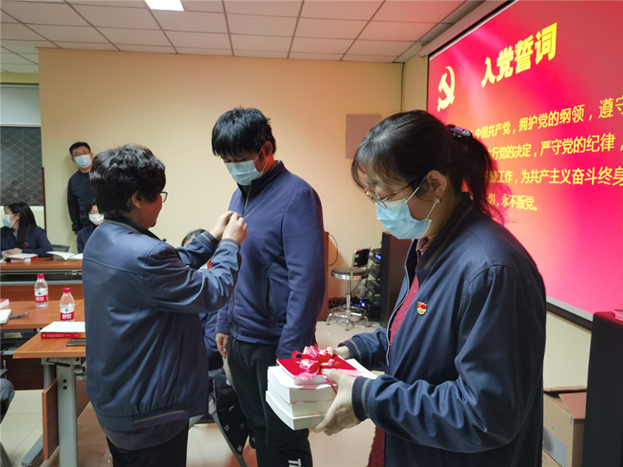 党委副书记陈彬为新党员颁发学习书籍并佩戴党徽