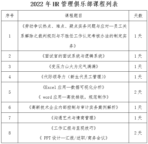 《HR管理俱乐部》课程紧密结合院属单位、高新技术企业的培训需求,选择学员关心的课题,如财税知识、劳动法、领导力等,采用讲师讲解、分组研讨、案例分析、书面测评等培训形式,让学员在轻松活跃的氛围里学习。