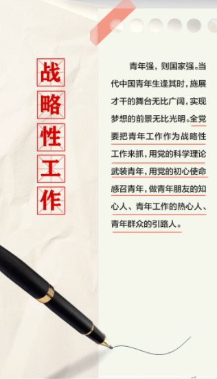 战略性工作:全党要把青年工作作为战略性工作来抓,用党的科学理论武装青年,用党的初心使命感召青年,做青年朋友的知心人、青年工作的热心人、青年群众的引路人。