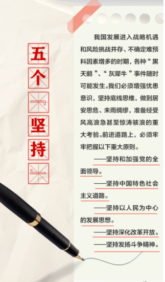五个坚持:坚强和加强党的全面领导;坚持中国特色社会主义道路;坚持以人民为中心的发展思想;坚持深化改革开放;坚持发扬斗争精神。