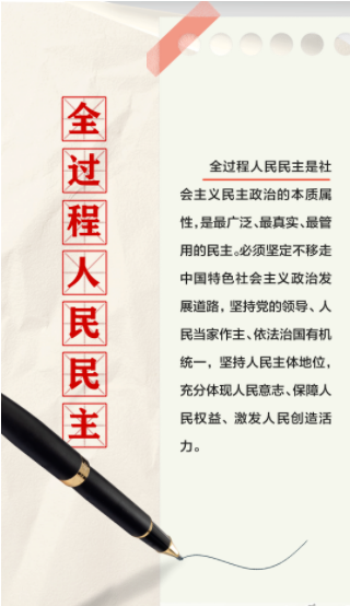 全过程人民民主:全过程人民民主是社会主义民主政治的本质属性,是最广泛、最真实、最管用的民主。要健全人民当家作主制度体系,扩大人民有序政治参与,保证人民依法实行民主选举、民主协商、民主决策、民主管理、民主监督。