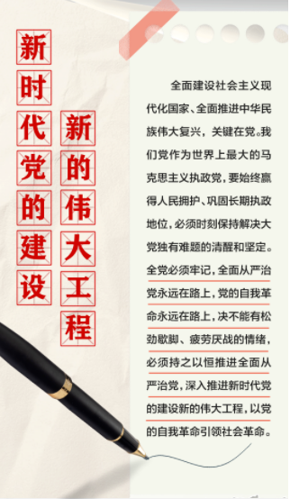 新时代党的建设:全面从严治党永远在路上,党的自我革命永远在路上。必须持之以恒推进全面从严治党,推进新时代党的建设新的伟大工程,以党的自我革命引领社会革命。