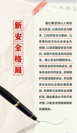 新安全格局:以人民安全为宗旨,以政治安全为根本,以经济安全为基础,以军事科技文化社会安全为保障,以促进国际安全为依托,统筹外部安全和内部安全、国土安全和国民安全、传统安全和非传统安全、自身安全和共同安全。