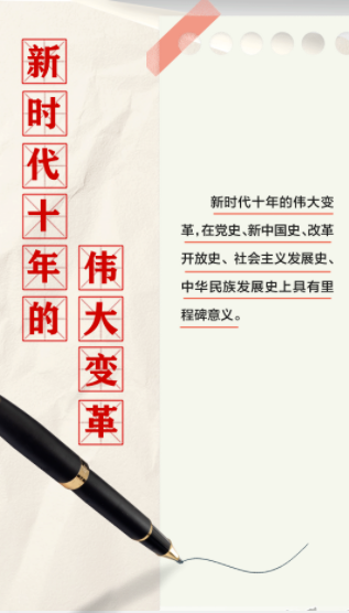 新时代伟大变革:新时代十年的伟大变革,在党史、新中国史、改革开放史、社会主义发展史、中华民族发展史上具有里程碑意义。