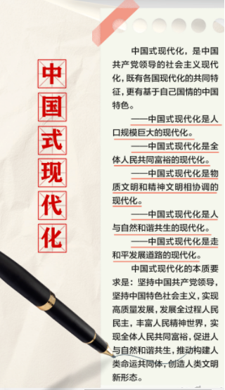 中国式现代化:中国式现代化,是中国共产党领导的社会主义现代化,既有各国现代化的共同特征,更有基于自己国情的中国特色。