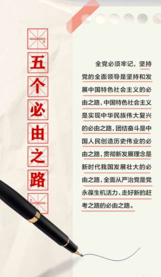 必由之路:全党必须牢记,坚持党的全面领导是坚持和发展中国特色社会主义的必由之路,中国特色社会主义是实现中华民族伟大复兴的必由之路,团结奋斗是中国人民创造历史伟业的必由之路,贯彻新发展理念是新时代我国发展壮大的必由之路,全面从严治党是党永葆生机活力、走好新的赶考之路的必由之路。