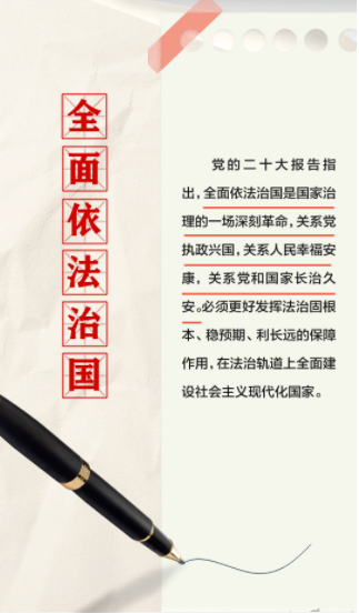全面依法治国:坚持依法治国、依法执政、依法行政共同推进,坚持法治国家、法治政府、法治社会一体建设,全面推进科学立法、严格执法、公正司法、全民守法,全面推进国家各方面工作法治化。