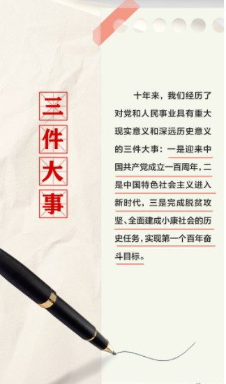 10年来的三件大事:一是迎来建党100周年;二是中国特色社会主义进入新时代;三是完成脱贫攻坚、全面建成小康社会的历史任务,实现第一个百年奋斗目标。