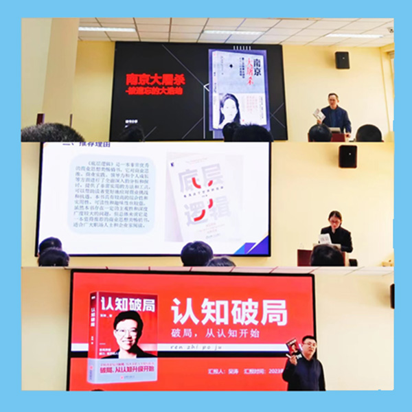 三位青年员工代表重点分享了自己阅读的好书:首先,青年社社长人事代理部的周千分享了一本张纯如著的《南京大屠杀》,给大家介绍了作者提笔的初衷,通过尖锐朴实的文字和图片,为大家还原了南京大屠杀的历史真相,深刻教导大家要铭记历史、勿忘国耻;档案管理部的王璨分享了刘润著的《底层逻辑》,书里从辩证的角度给读者提供了“万能”的逻辑思维,授人以鱼不如授人以渔,通过书中的逻辑思维,帮助大家多角度、辩证地思考;中高级人才部的吴涛分享了张琦著的《认知破局》,从认知和方法两方面,简洁明了的为大家解释了商业的本质是为了不断追求更高的交易效率、解题思路比答案重要、产品定位要清晰等道理,让大家明白了在工作中要不断思考、不断更新,从而提高自己的认知和工作能力。