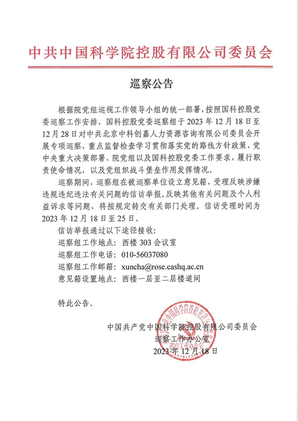 国科控股党委对中科创嘉党委开展专项巡察公告