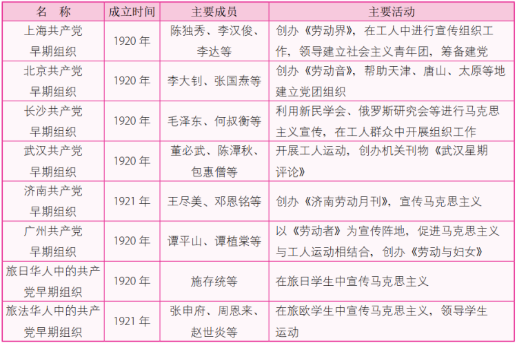 各地共产党早期组织一览表