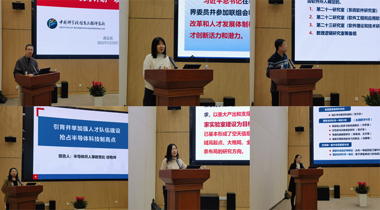 在交流环节,信息工程研究所、过程工程研究所、软件研究所、半导体研究所、空天信息创新研究院、数学与系统科学研究院六家单位的人事处负责人做了专题报告,认真详细地介绍了各家在人才队伍建设方面的具体举措,围绕人才的引进与储备、人才的培养与提升、人才的激励与留住、人才的评价与选拔等内容进行了经验分享和展望思考。