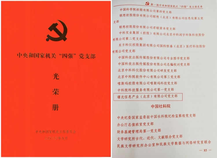 2023年9月,中央和国家机关工委命名一批党支部为“中央和国家机关‘四强’党支部”,中科创嘉党委所属曙光信息产业(北京)有限公司党支部获此殊荣。