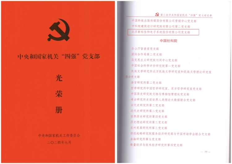 2024年7月,中央和国家机关工委命名一批党支部为“中央和国家机关‘四强’党支部”,中科创嘉党委所属北京新松佳和电子系统股份有限公司党支部获此殊荣。