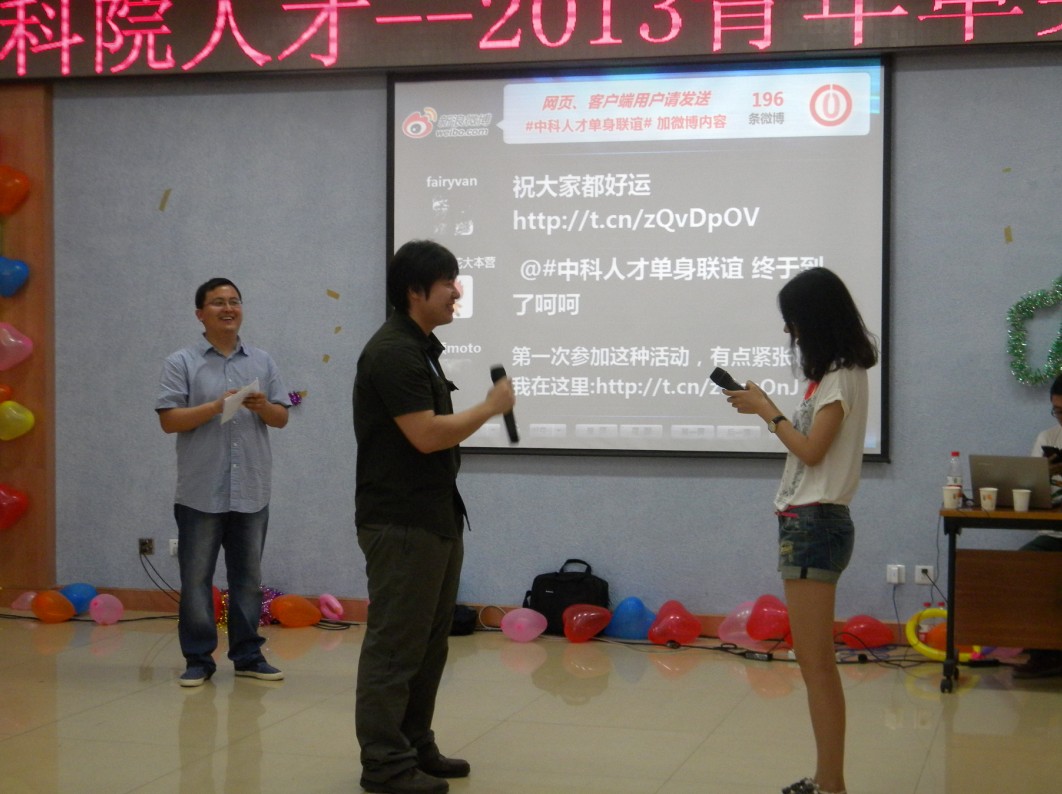 活动开始前,中科院人才交流开发中心陈彬副主任寄予青年朋友们特别的祝福,希望大家踊跃参与节目表现自己,并渴望活动之后能听到喜讯和吃到喜糖。活动进行中,主持人先以“认知游戏”为主导,让大家逐步熟悉起来,现场气氛被带动活跃起来,特邀键盘手在适当的时刻配以活泼的音乐,使得大家心情愉悦并给予极高的热情配合。“微博滚动大屏幕”时刻上传着参与活动的青年男女们的各类心情、感触、话题等,配合着整个活动的主题。更有有心之士,提前备好了音乐,现场展现了歌喉,博得个满堂彩。帅哥靓女都是大方得体的参与各类游戏环节中,并很自信的一一介绍自己,希望通过活动能找到心仪对象。经典环节之“传递纸条”中,大家踊跃的对感兴趣的对象提问,出现了很有“爱拼才会赢”的勇敢者,为了自己的真爱积极争取。“爱情大转盘”让每个人都有机会认识到场的所有人,交流时间虽然很短,但心仪对象已铭记于心。伴随着激情飞扬的音乐,整个活动进入到高潮,由大家推荐出本场人气王男女各一名,大家喊出候选人的号码,各自为自己拉票加油后选出,并得到了精美礼品。