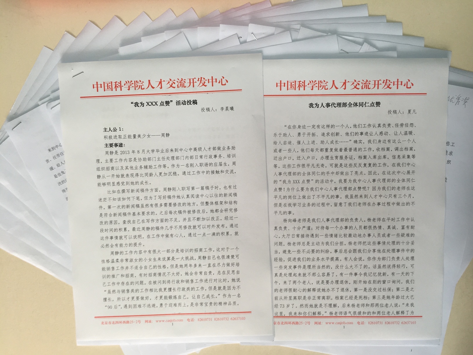 在我们身边一定有这样的人,他们工作认真负责、任劳任怨、乐于助人、积极进步、勇于开拓、追求创新,他们做的事情虽平凡但真情感人,让身边的人感到温暖、得到启迪、催人上进、助人成长……为了鼓励员工做负责任的有心人,积极发现身边同事的美好品质,在平凡中寻找不平凡的人和事,从而鼓励、传递、弘扬人才中心正能量,形成积极向上的工作氛围,以期更好地为客户提供周到贴心的服务,中科院人才中心举办了“我为XXX点赞”活动。