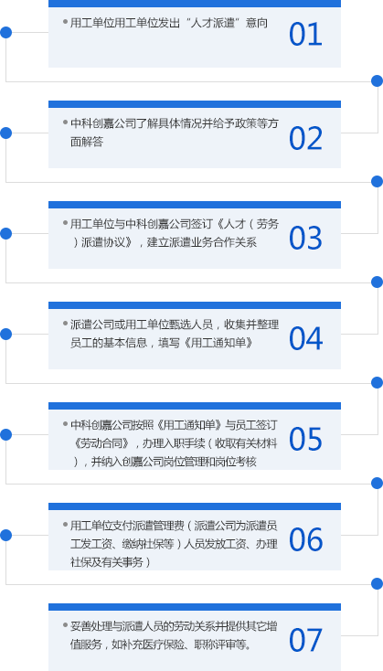 派遣人员招聘、离职、档案、工资、保险、组织关系、招工、职称、各项人事证明等事务性工作均由人才派遣专业机构一条龙的完成。